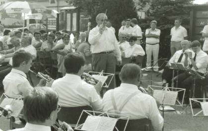 CDU-Vorsitzender Wolfgang Weyland dirigiert die Kapelle beim Platzkonzert vor der Schützenhalle