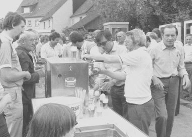 Beim CDU-Platzkonzert ist immer was los. Theo Barwe (verst.) und Wolfgang Geisel haben alle Hände voll zu tun. Rechts: Ratsmitglied Alfons Deitmerg (verst.).