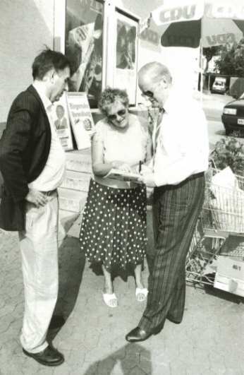 Wahlkampf in Herscheid: Wolfgang Geisel und Wolfgang Weyland im Gespräch mit einer Bürgerin vor dem "Kaufpark"